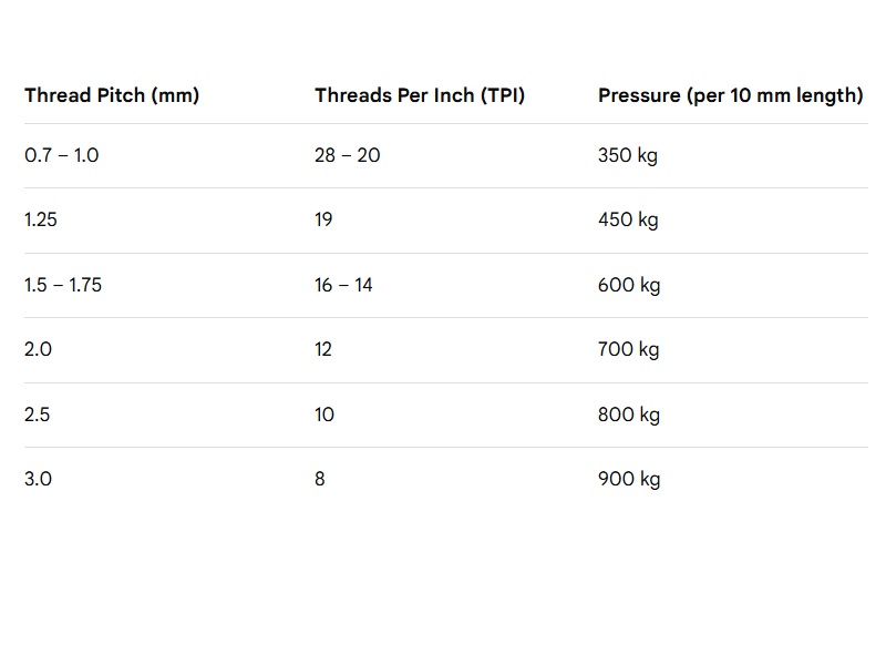 The table shows how much pressure should be applied for every 10 mm of thread length, depending on the thread pitch: