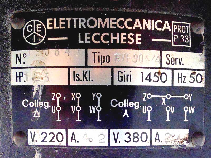 Engine power: 1.25 HP (1 KW), speed 1450 rpm.