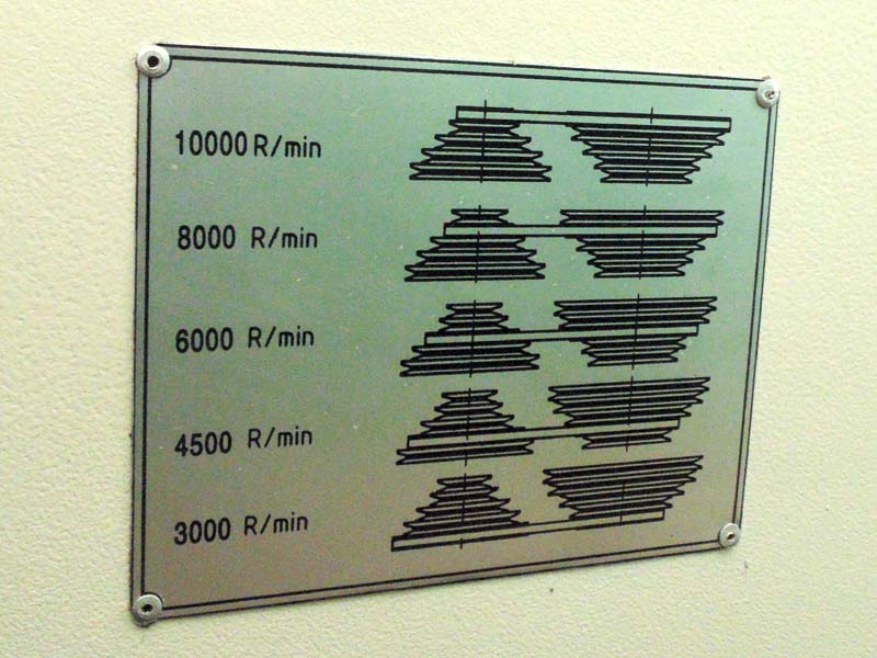 Классическая клиноременная передача на ступенчатых шкивах. Ведущий шкив (двигатель): расположен слева на чертеже. Ведомый шкив (шпиндель/вал): расположен справа. Принцип работы: Для достижения максимальной скорости (10.000 об/мин) ремень должен располагаться на наибольшей окружности ведущего шкива и наименьшей окружности ведомого шкива. Это высококачественный промышленный станок, предназначенный для профессионального использования в столярных мастерских.
