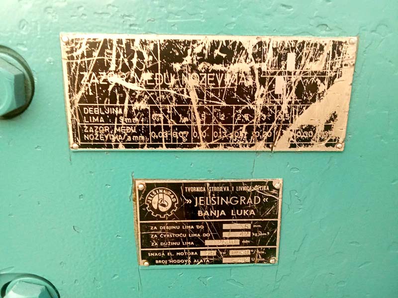 JELŠINGRAD Makaze za lim se nalazе u Mačvanskoj Mitrovici, ulica Žarka Vučinića 32B (deo grada Sremska Mitrovica), Srbija. Mašina je u odličnom stanju i može se testirati u radu. Transport pada na račun klijenta, a ova giljotina za lim će se besplatno utovariti u transportno vozilo klijenta, posle obavljene kupovine u našoj kompaniji. Apokalipsa d.o.o. ima preko 2.500 polovnih, remontovanih mašina na lageru. Sve mašine možete pogledati i isprobati u halama preduzeća. Mašine su većinom Italijanske proizvodnje, od livenog čelika. Imamo u ponudi kompletne linije za proizvodnju drvenih gajbi marke Corali. Komplet linije za proizvodnju: nameštaja, peleta, paleta, drvenih vrata i prozora, kao i parketa.