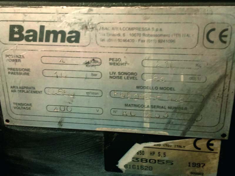 Kompresor BALMA 5528_25 se nalazi u Mačvanskoj Mitrovici, ulica Žarka Vučinića 32 b (deo grada Sremska Mitrovica), Srbija. Mašina je u dobrom stanju i može se testirati u radu. Prevoz mašine je o trošku klijenta, a nakon kupovine od naše firme, vijačni kompresor će se besplatno utovariti na vozilo klijenta. Apocalipse d.o.o. ima na lageru više od 2.500 polovnih i popravljenih mašina. Sve mašine možete pogledati i testirati u halama kompanije. Mašine su uglavnom italijanske proizvodnje, od livenog čelika. Nudimo kompletne linije za proizvodnju drvenih gajbi brenda Corali. Nudimo sveobuhvatne proizvodne linije za: nameštaj, pelet, palete, drvena vrata i prozore, kao i parket.