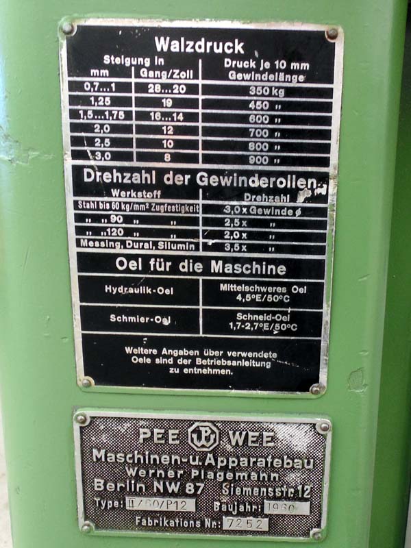 Model PEE WEE Type II/60/P12 je robusna nemačka mašina za hladno valjanje navoja, koja se koristi za preciznu izradu spoljašnjih navoja na cilindričnim delovima poput vijaka, svornjaka i vratila. Ovo je industrijska mašina velike snage, a oznaka „P12“ se obično odnosi na njenu maksimalnu silu pritiska od 12 tona.