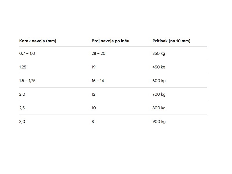 Tabela prikazuje koliki pritisak treba primeniti na svakih 10 mm dužine navoja, u zavisnosti od koraka navoja: