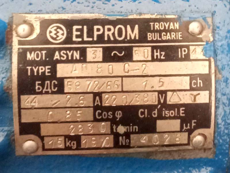 Snaga motora: 1,5 KS (1,1 kW), brzina rotacije 2830 ob/min.