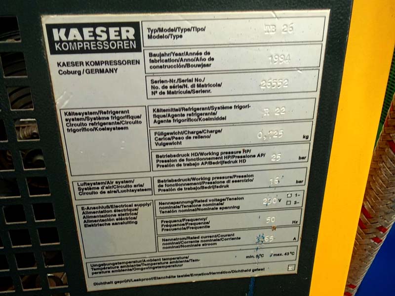Sušač vazduha KAESER 5527_25 se nalazi u Mačvanskoj Mitrovici, ulica Žarka Vučinića 32B (deo grada Sremska Mitrovica), Srbija. Mašina je u odličnom stanju i može se testirati u radu. Transport pada na račun klijenta, a ovaj sušač vazduha za kompresor će se besplatno utovariti u transportno vozilo klijenta, posle obavljene kupovine u našoj kompaniji. Apokalipsa d.o.o. ima preko 2.500 polovnih, remontovanih mašina na lageru. Sve mašine možete pogledati i probati u halama preduzeća . Mašine su većinom Italijanske proizvodnje, livene. Imamo u ponudi kompletne linije za proizvodnju drvenih gajbi marke Corali. Komplet linije za proizvodnju: nameštaja, peleta, paleta, drvenih vrata i prozora, kao i parketa.